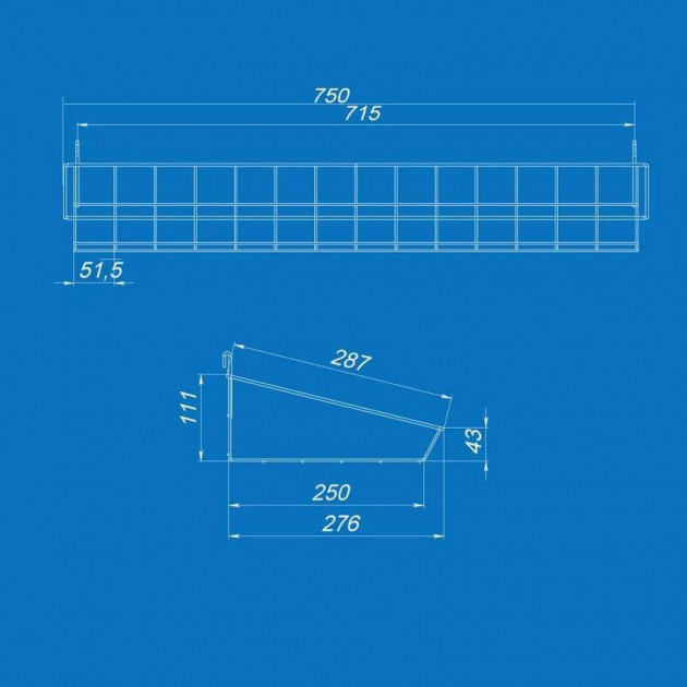 Крепление: 2 металлических крючка Совместимость: сетки с ячейками 50×50 мм и 100×100 мм Конструкция: с передним бортиком для фиксации товара