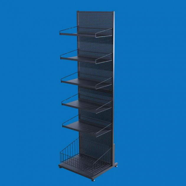Торговый перфорированный стеллаж на 5 навесных полок и глубокой корзиной (50×185 см, чёрный, разборн..