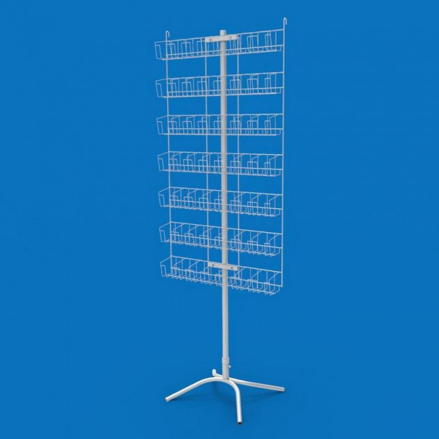 Модель представляет собой полностью готовое решение, включающее 7 ярусов, каждый из которых имеет 7 карманов. Конструкция оснащена крючками для навесного монтажа, а также устойчивой опорой, что позволяет использовать её как напольный стенд.