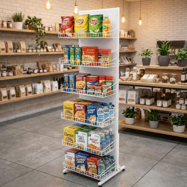 Перфорована стійка для магазину в білому кольорі— це універсальне торговельне обладнання, яке дозволяє зручно розміщувати товари за допомогою кошиків.
