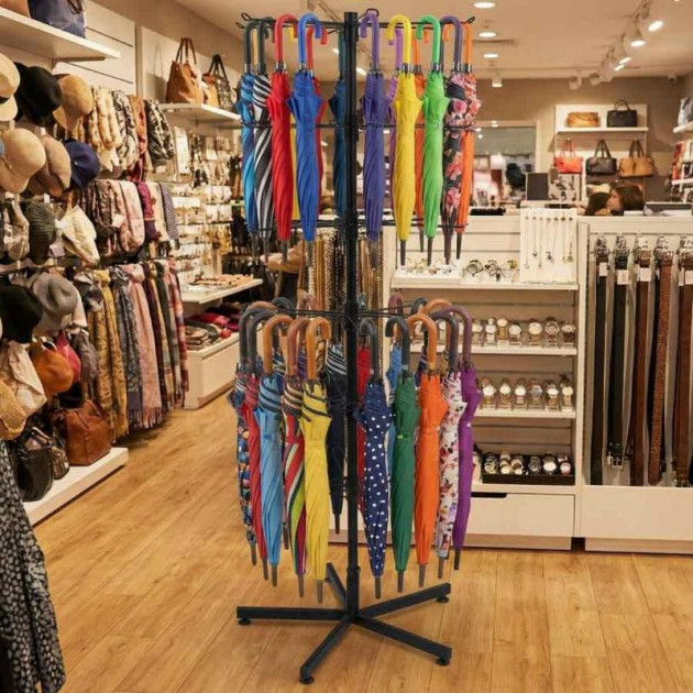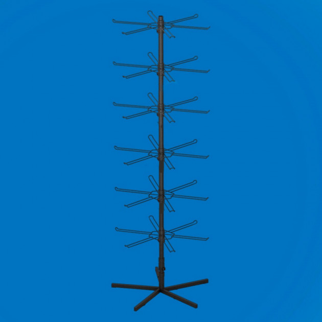 Торгова стійка в чорному кольорі на 36 подвійних гачків — універсальне рішення для магазинів будь-якого формату. Модель складається з 6 ярусів, на кожному з яких розміщено по 6 подвійних гачків, що дозволяє викладати велику кількість товару на мінімальній площі. Це ідеально підходить для пакетів, кімнатних тапочок, аксесуарів, ременів, парасольок, іграшок та інших підвісних товарів.