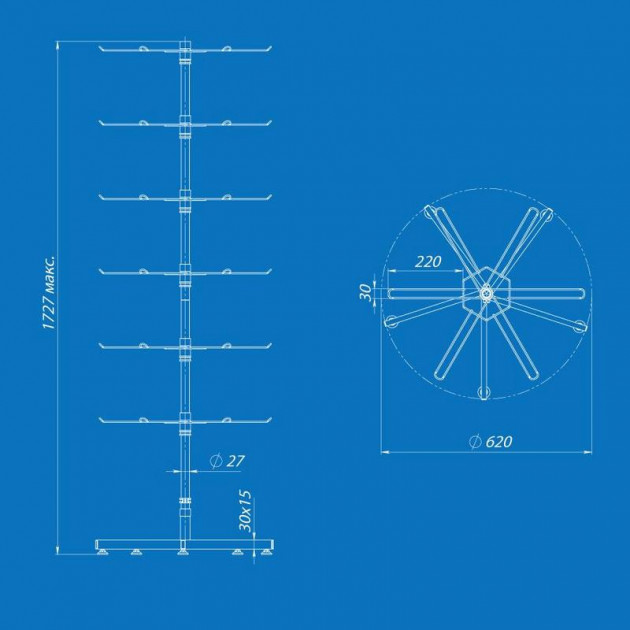 Стійка виготовлена з міцного металу і обладнана 5-променевою основою, яка забезпечує максимальну стійкість навіть при повному завантаженні. Конструкція легко збирається, не вимагає спеціальних інструментів, а завдяки продуманій формі займає мінімум місця в торговому залі.