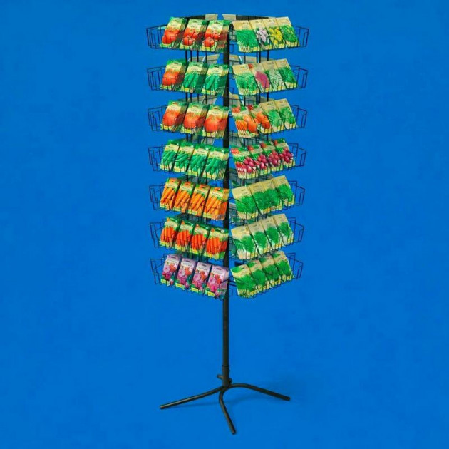 Вращающаяся напольная стойка — удобное торговое оборудование для демонстрации и продажи пакетированных семян. Компактная конструкция позволяет разместить большое количество товара, эффективно используя торговое пространство.