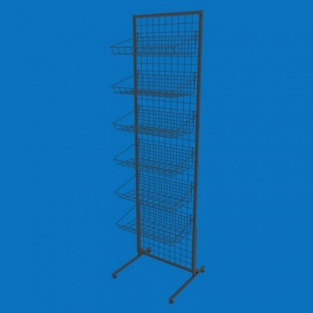 Універсальна стійка з сітчастою основою і 6 знімними кошиками — це функціональне торговельне обладнання, створене для компактної і наочної викладки товару. Завдяки стійкій металевій конструкції і модульності, її легко адаптувати під різні завдання і типи продукції.