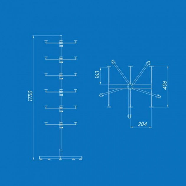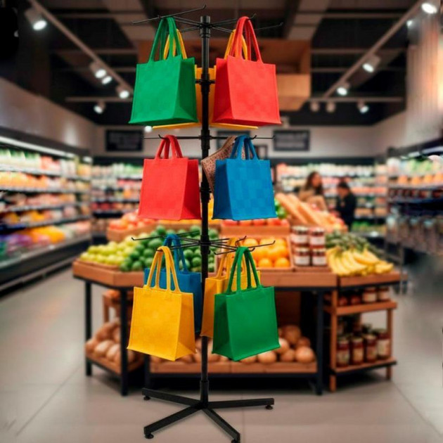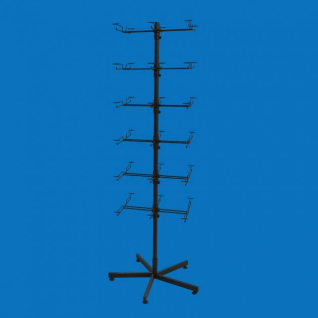 Модель оснащена 6 ярусами одинарных крючков. Все ярусы вращаются вокруг центральной оси, обеспечивая легкий доступ к продукции со всех сторон.