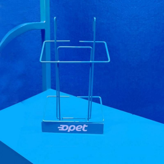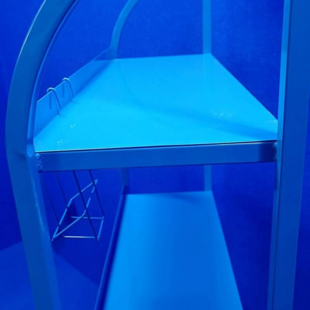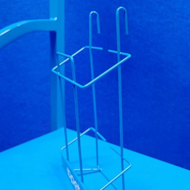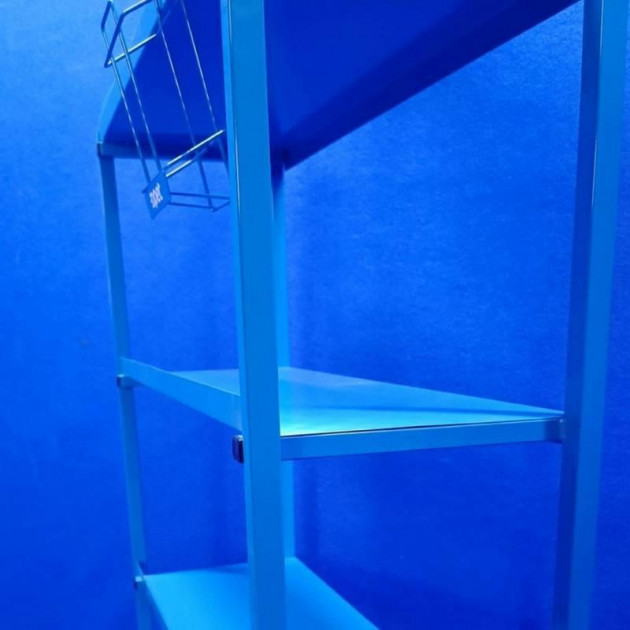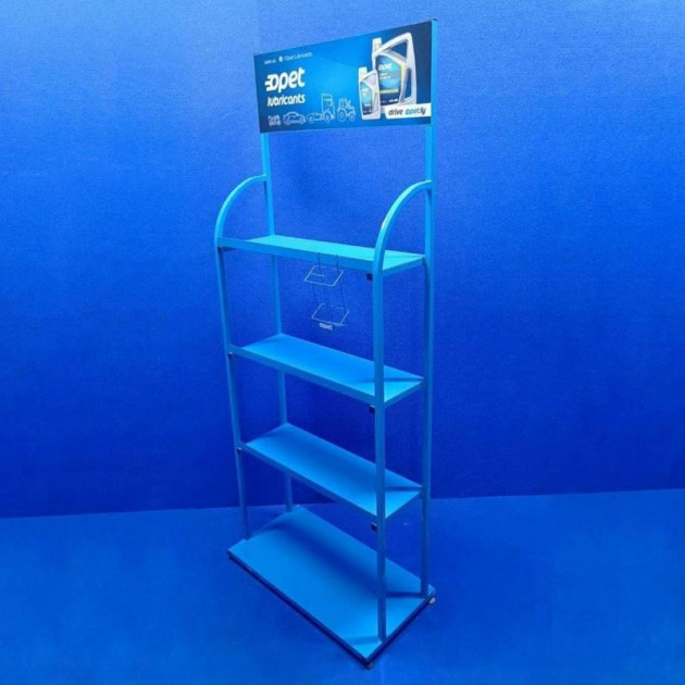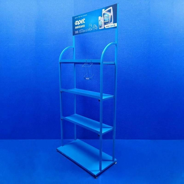 Металлический синий стеллаж для автомасел с брендированием и карманом для визиток